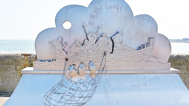 A plaque tells the story of Jesus appearing disciples after his death. One side of the sculpture shows the sad fisherman; they’d fished all night and caught nothing. The other shows their delight at finding fish – after following Jesus’ instructions.