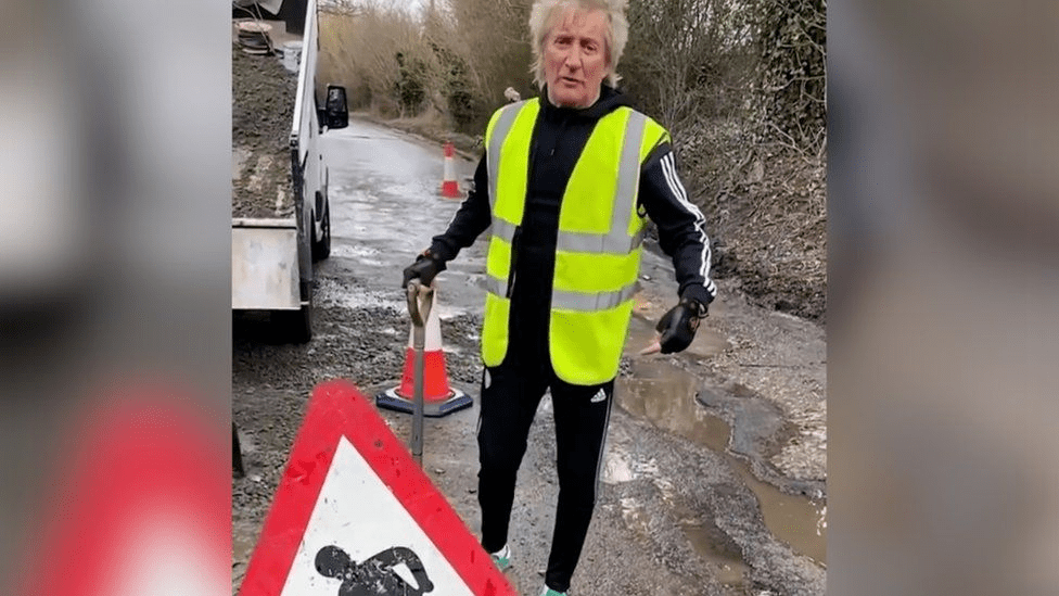 Yesterday Sir Rod Stewart was shovelling gravel, fixing potholes on a road near his home in Essex…