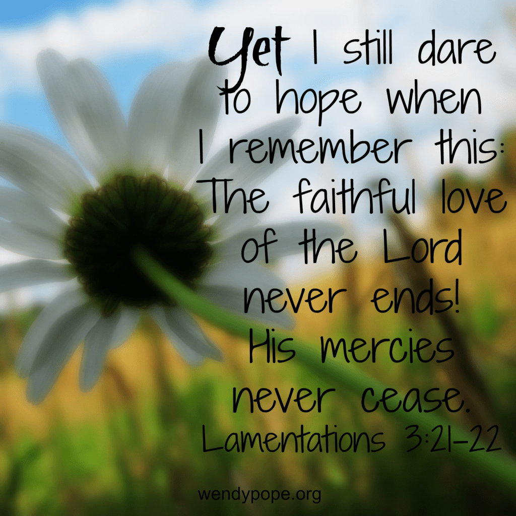 This morning I read Jeremiah’s words in Lamentations 3: ‘The thought of my suffering and homelessness is bitter beyond words. I will never forget this awful time, as I grieve over my loss. Yet I still dare to hope when I remember this: