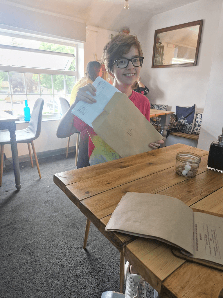 Theo: GCSE results arrived for 16-year-olds this week. This is Theo – pleased with and proud of his. And now: