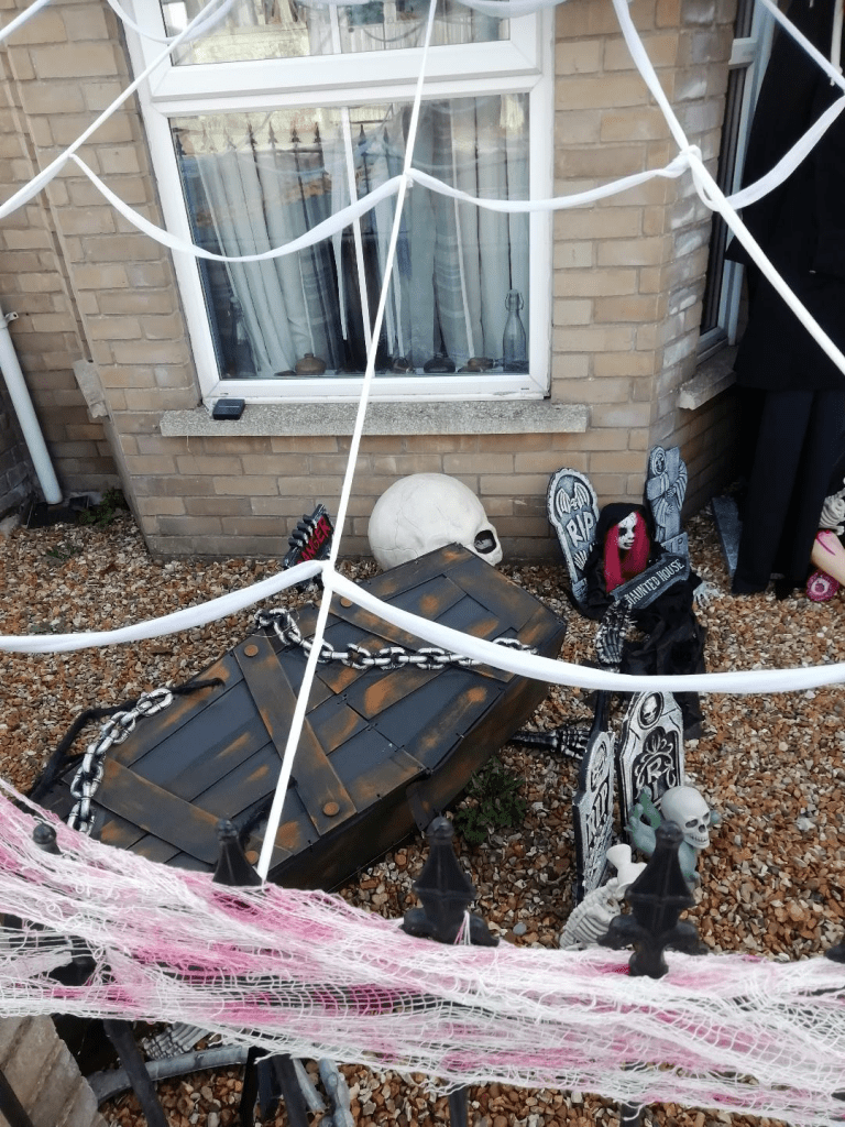 Yesterday I helped Ferne prepare for this morning’s ‘Pumpkin Heroes’ event at our church. On my way home I passed this house – preparing for Halloween, next Monday!
