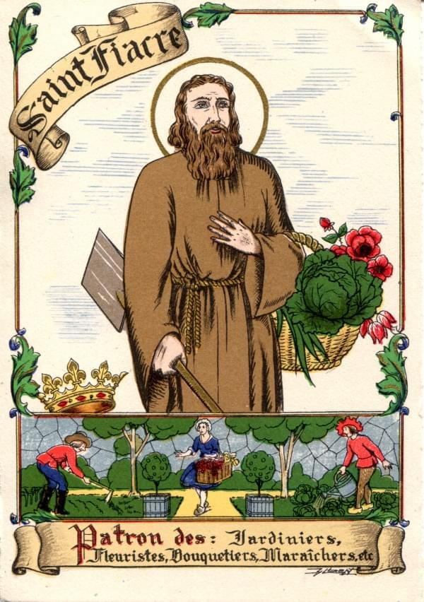 Fiacre is now remembered as the patron saint of vegetables growers, ploughboys, Parisian taxi-cab drivers, those with haemorrhoids, infertility, venereal disease… (and more!!)
