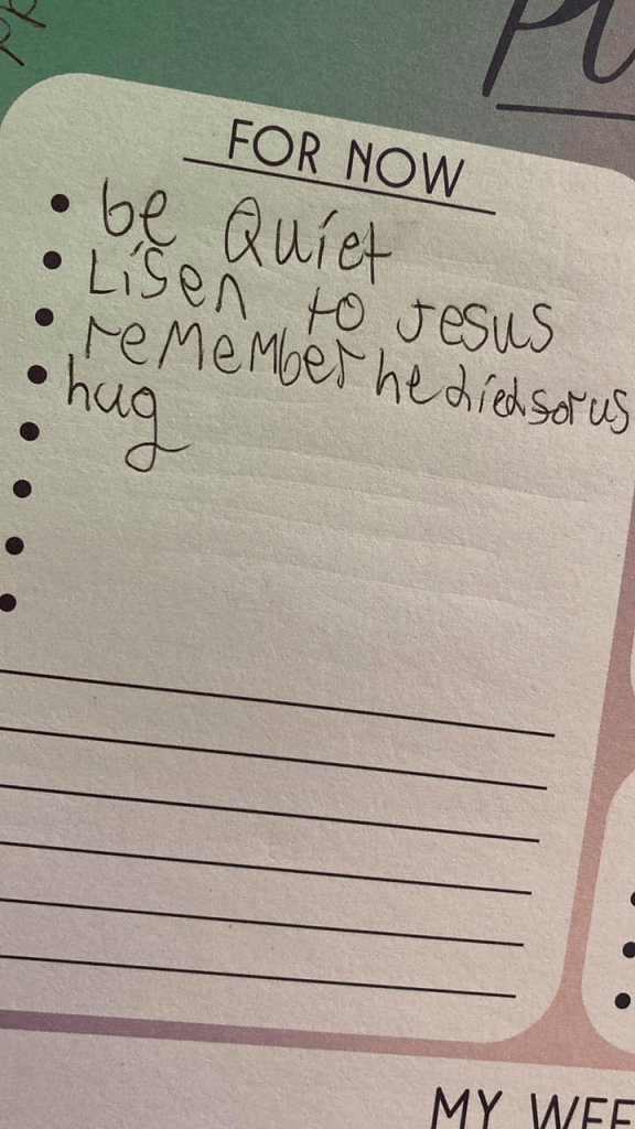 I love the simplicity of Maya’s thinking. Be quiet; listen to Jesus; remember he died for us; hug. It’s also profound. Children sometimes get it better that adults.