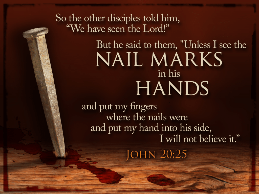 As an 11 year old I was in a farm accident where my arms and main nerves were severed. No feeling below the elbows and very little limited use of hands and fingers for years. I tell the (longer) story after playing the piano for groups. Many will not believe me until I slide up my sleeves on both arms to see the scars (one on one). It always reminds me of Thomas. He doubted, saw and believed for all of us doubters.