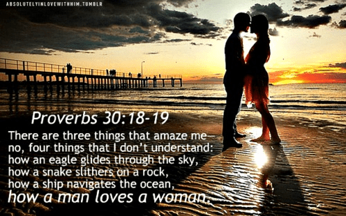 ‘There are three things that are too amazing for me, four that I do not understand: the way of an eagle in the sky, the way of a snake on a rock, the way of a ship on the high seas, and the way of a man with a young woman.’