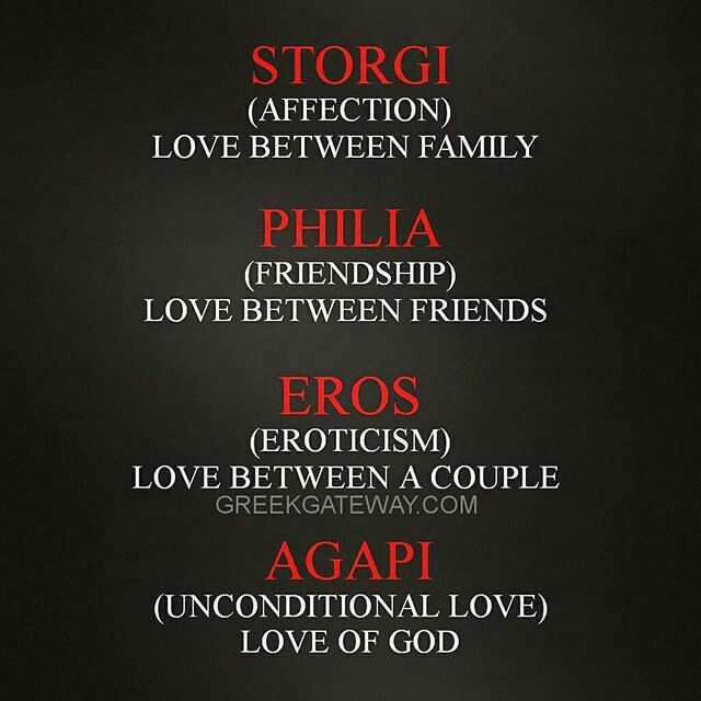 ‘Storge’ – family love; ‘Eros’ – romantic, sexual love; ‘Philia’ – love for close friends; ‘Agape’ – unconditional, giving love that doesn’t require recognition or reward.