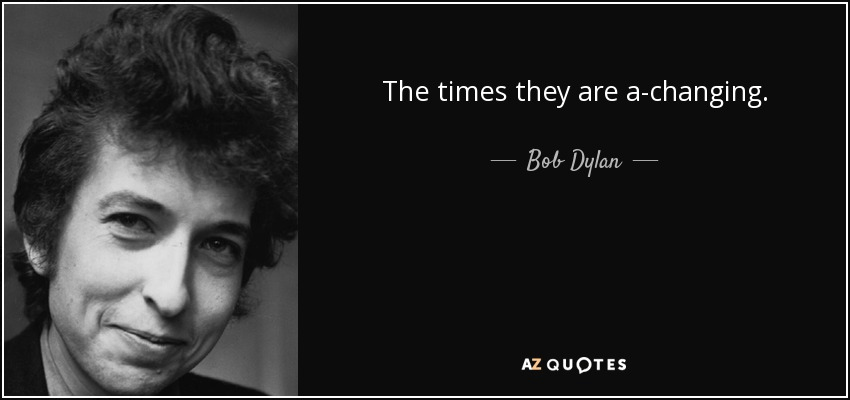 Bob Dylan sung ‘The Times they are a-changing’. The teenage me learnt the song and played it on my newly-purchased guitar. I sort of understood it. Nearly sixty years later a-changing times haven’t stopped a-changing.