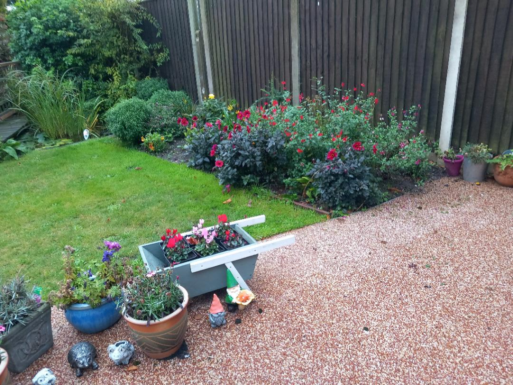 These salvias, dahlias and cyclamen are still in flower because we planted them…We’re enjoying potatoes, beans and carrots from ‘off the estate’ because in the spring I prepared and planted.