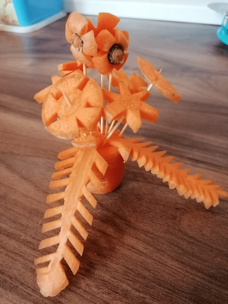 It was an early start on Monday morning. Daughter-Jo had an idea – but action was required. Jo and Luca worked together… Luca took his carved carrot to school.