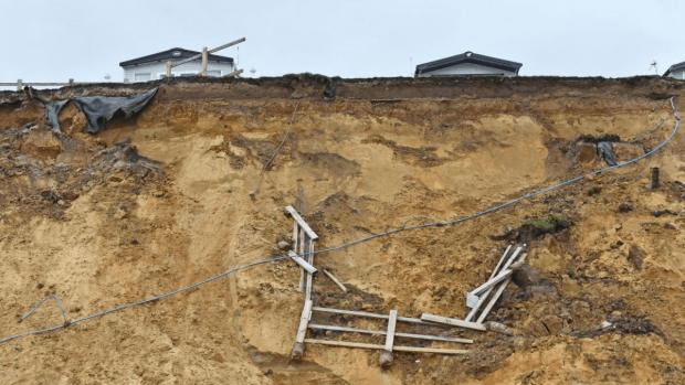 Due to unprecedented rates of coastal erosion one chalet on the site was demolished last year, and these properties were deemed unsafe. Weather permitting, the demolition will take place this weekend.