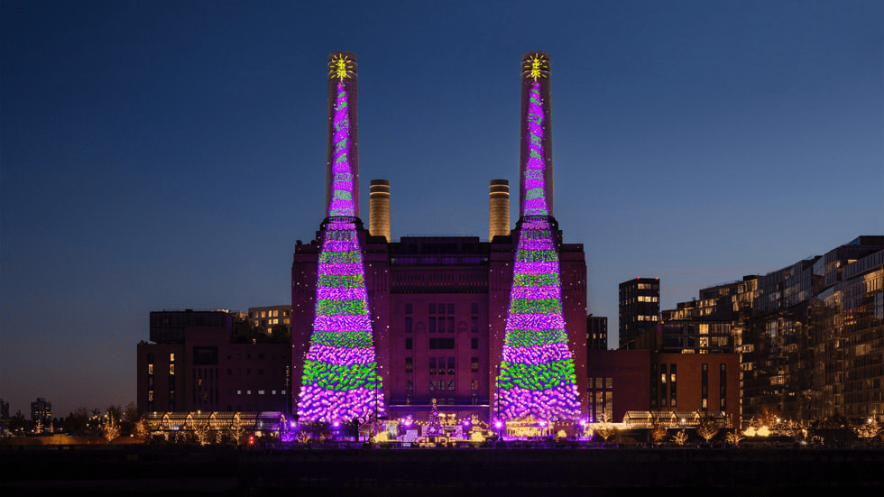 This is artist David Hockney’s latest work ‘Bigger Christmas Trees’ at London’s Battersea Power Station, Apple’s U.K. headquarters. Each night in December until Christmas Day, a pair of Christmas trees will light up this London landmark.
