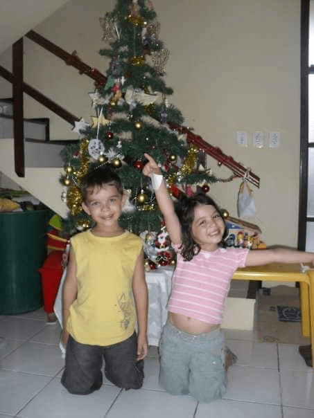 Granddaughter-Hannah posted two pictures of her by a Christmas tree… as a young child with brother-Zak in Brazil…