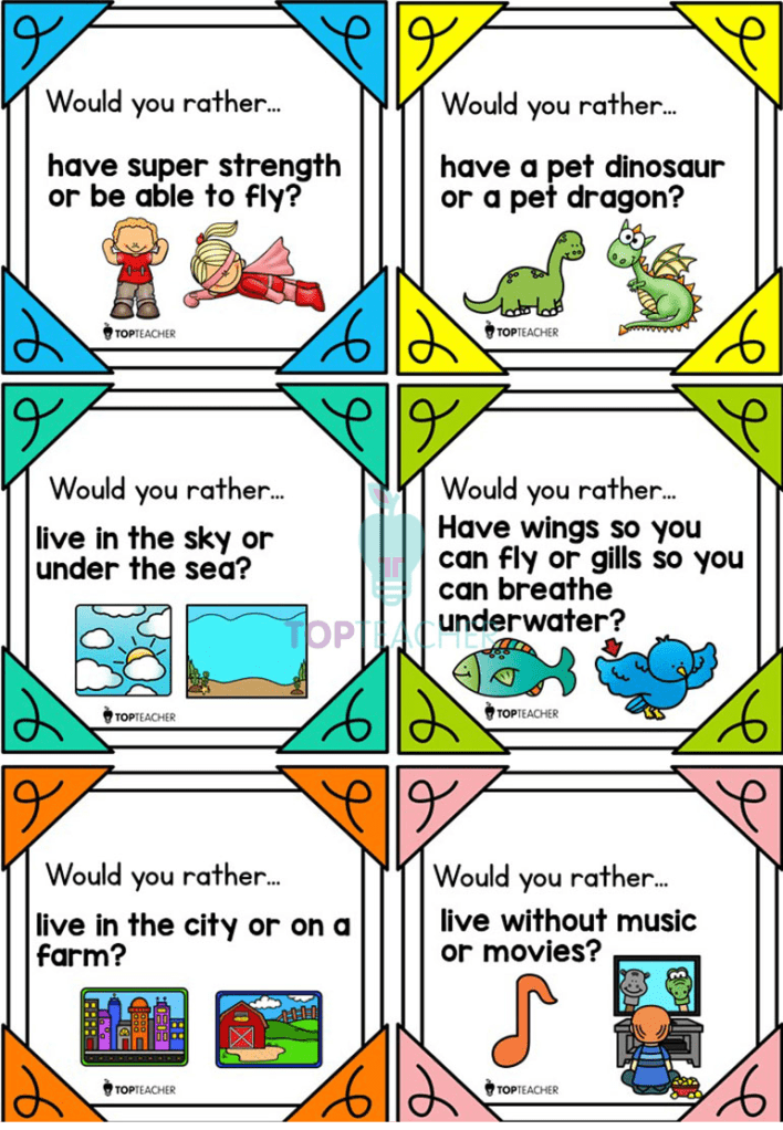 They then became more interesting choices ‘Would you rather …live in Hogwarts or Narnia? …be the best player in a losing team or the worst player in a winning team? …have five good friends or one best friend?’