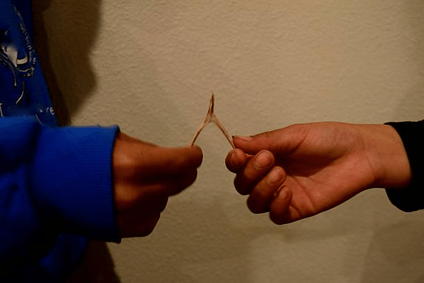 We wanted to pull the wishbone, to break the bone and get the bigger piece; we knew that the one with the bigger piece could make a wish that would come true. It was a bit of a joke… but perhaps it would work.
