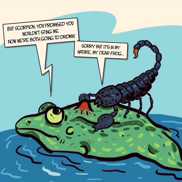 Frog asks Scorpion why it stung; Scorpion replies: ‘I couldn’t resist it. It’s my character.’ Frog and Scorpion both die.