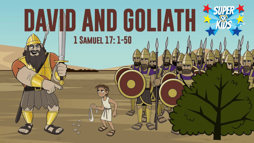 The narrative includes: ‘David ran and stood over him (Goliath). He took hold of the Philistine’s sword and drew it from the sheath. After he killed him, he cut off his head with the sword.’