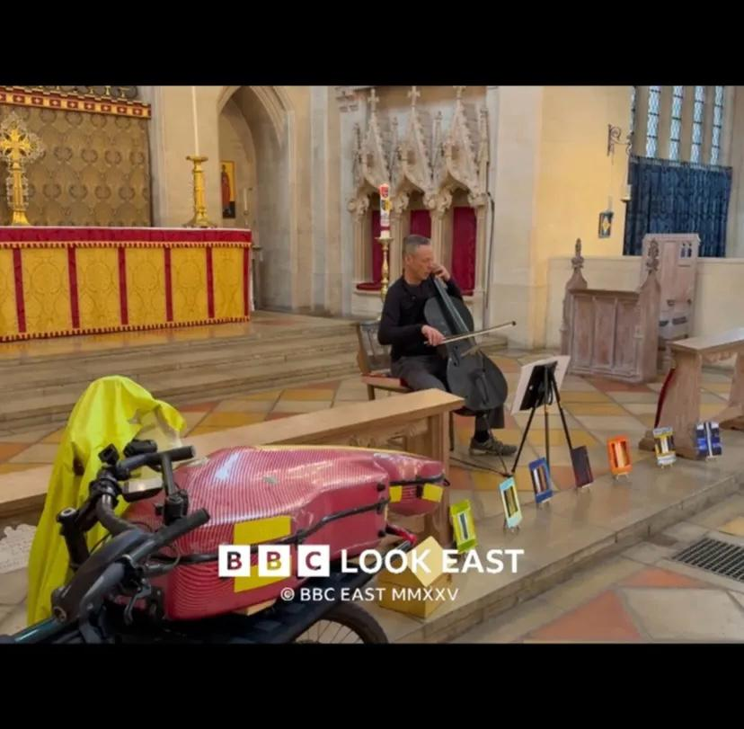 Last night’s local news showed Kenneth Wilson from Renwick, Cumbria. He’s on a 2,000 mile bike ride, with his cello, visiting all 42 English cathedrals, performing in nearly all of them.