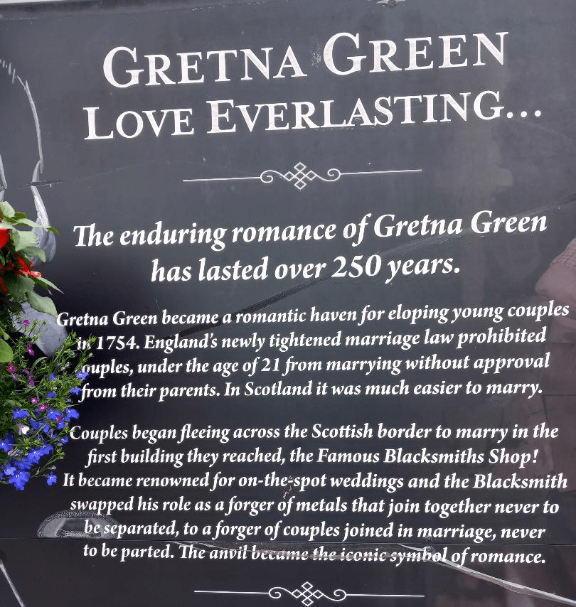 Our first stop in Scotland was at Gretna Green. We learnt more of the history of English couples eloping to get married in Gretna Green… In 1754 the English law changed; couples seeking a quick or easier marriage would cross the border into Scotland, where Scottish law wasn’t so strict.