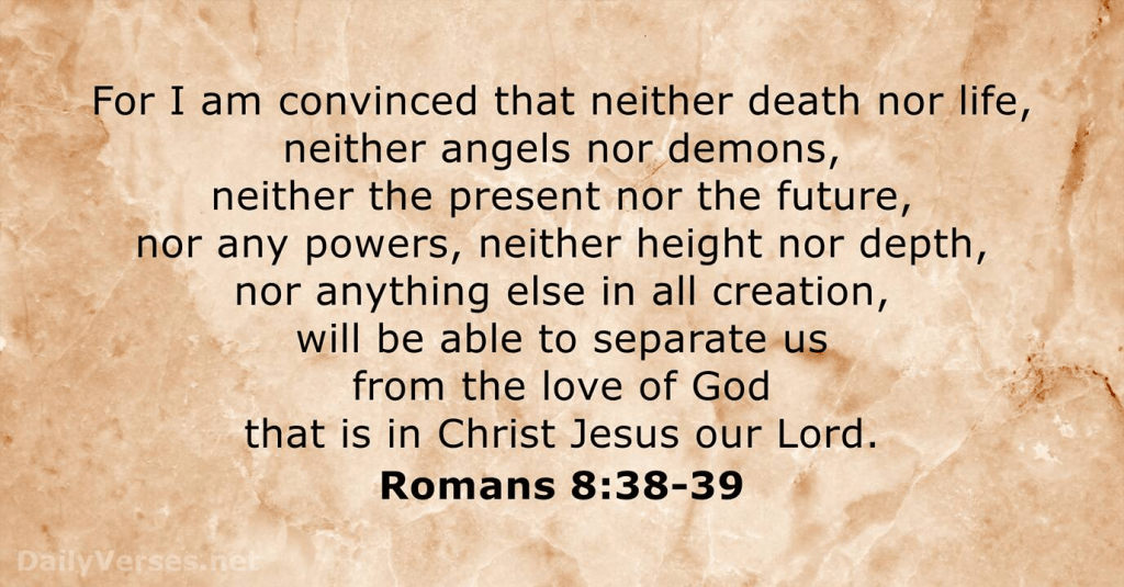‘…If God is for us, who can be against us?… I am convinced that neither death nor life, neither angels nor demons, neither the present nor the future, nor any powers, neither height nor depth, nor anything else in all creation, will be able to separate us from the love of God that is in Christ Jesus our Lord…’