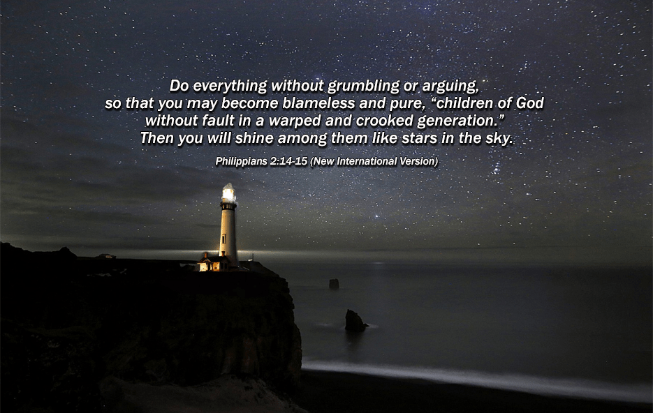 ‘Do everything without complaining or arguing, so that you may become blameless and pure, ‘children of God without fault in a warped and crooked generation.’ Then you will shine among them like stars in the sky..’