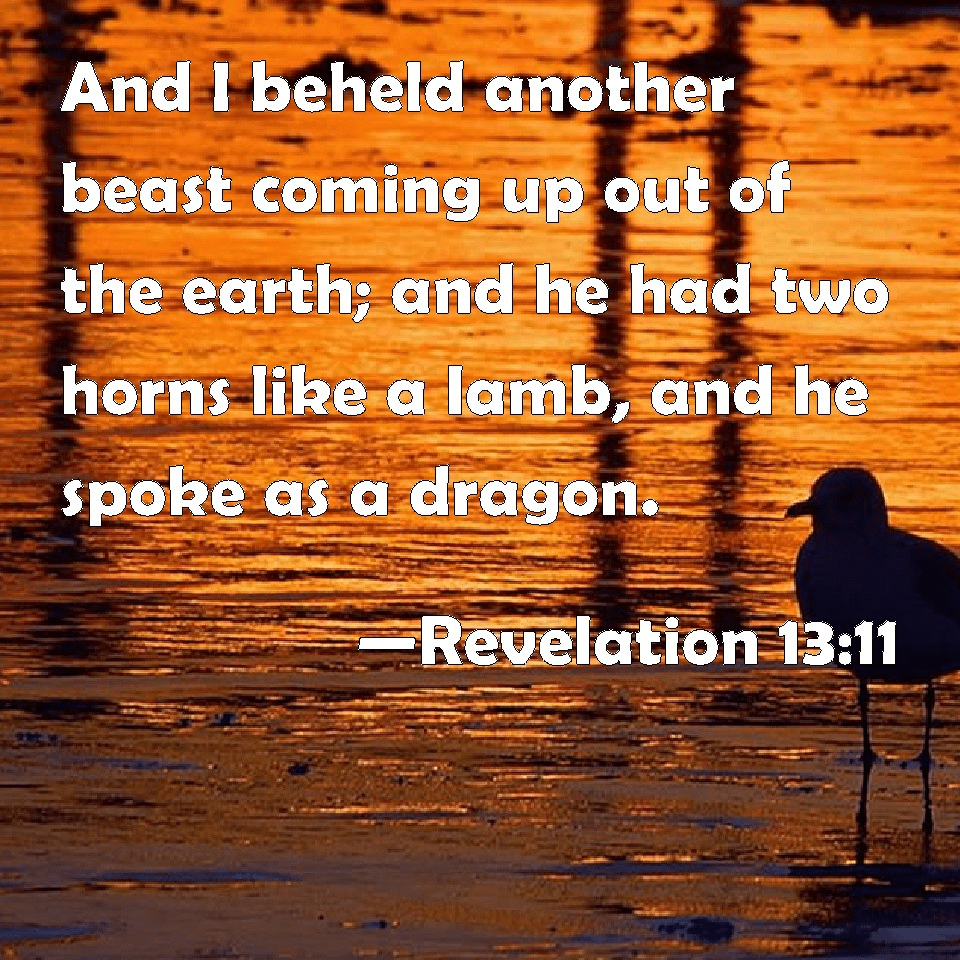 …Reading Revelation in my Bible …The battle of God against Satan, good guys against bad guys… chapter 13 verse 11… a creature that looks like a lamb but sounds like a dragon.