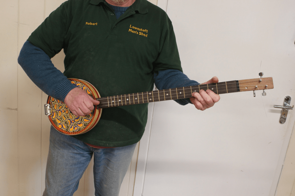 On Saturday, at Men’s Shed, Robert was finishing the banjo that he’d made. It was an excellent piece of work. He explained to me the process and the details of construction. His significant skill and expertise were clearly evident.