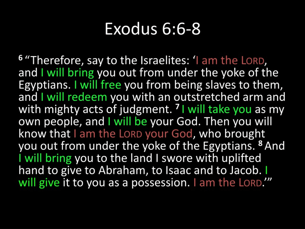 ‘I am the Lord… I will bring you out… I will free you… I will redeem you… I will take you… I will be your God… I will bring you… I will give it to you… I am the Lord.’