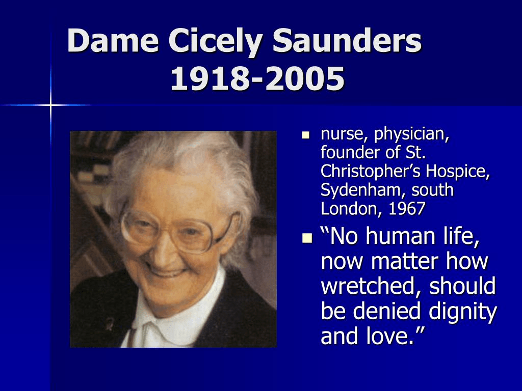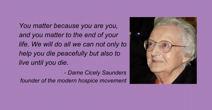 Dame Cicely Saunders, remembered for her work in terminal care research and her role in founding the hospice movement, said: ‘You matter because you are you, and you matter to the end of your life. We will do all we can not only to help you die peacefully, but also to live until you die.’