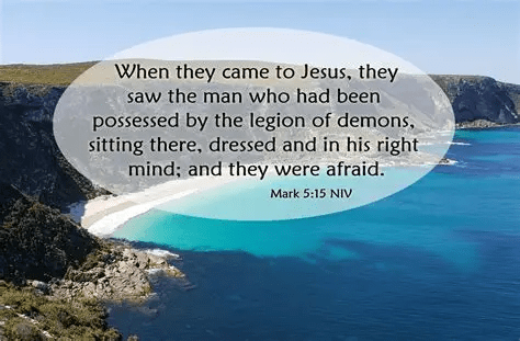 His ‘mad’ condition was attributed to demonic presence. Jesus comes, accepts him as he is, talks to him, casts out the demons, and he’s left ‘clothed and in his right mind’.