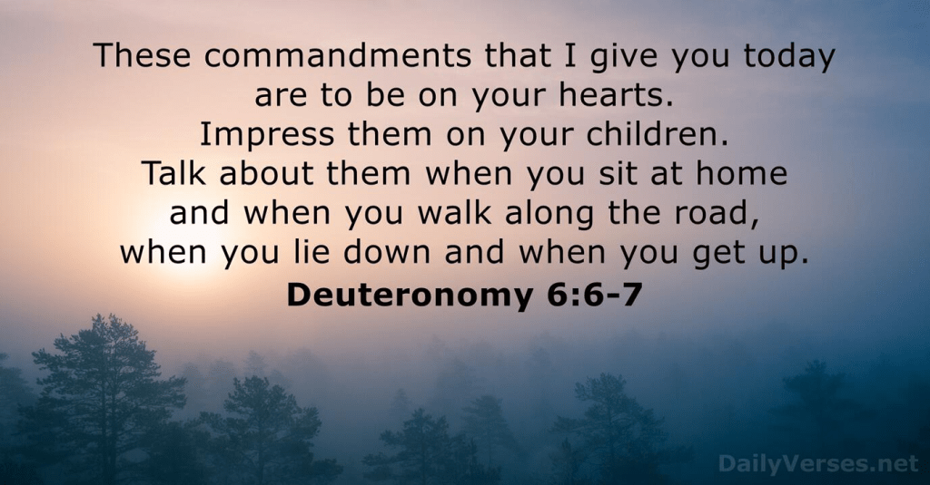 ‘Hear, O Israel: The Lord our God, the Lord is one. Love the Lord your God with all your heart and with all your soul and with all your strength. These commandments that I give you today are to be on your hearts.’ (6:4-6)