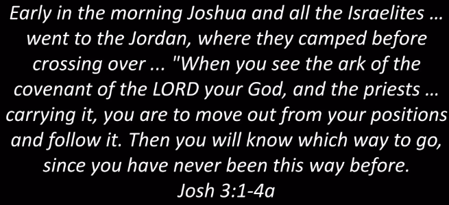 The nation, about to enter their Promised Land, arriving at the banks of the River Jordan. are told that their God will lead them forward: ‘Then you will know which way to go, since you have never been this way before.’