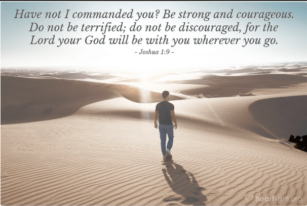 I’m reading ‘Joshua’. Moses, Israelite leader for forty years, has died. New leader Joshua is told, ‘Be strong and courageous! do not be afraid or discouraged. For the Lord your God is with you wherever you go.’