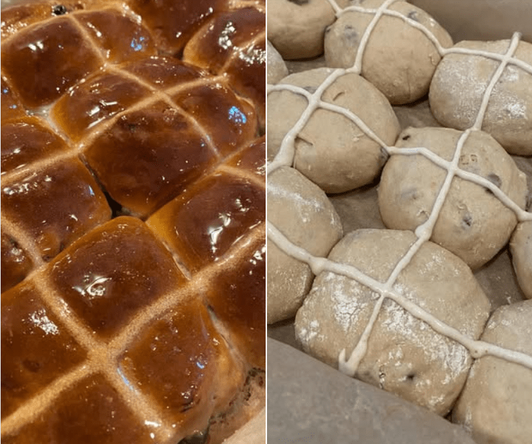Julie’s menu includes ‘Hot Cross Buns’: ‘Les Hot Cross Buns sont de petites brioches épicées… consommées à Pâques sur lesquelles on dessine une croix en symbole de la crucifixion.’