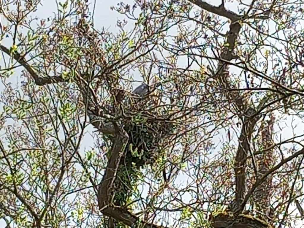 We saw a few birds – nothing unusual. Hearing an unfamiliar sound we looked up. A large grey heron was on a nest, alongside two baby herons, at the top of a tall tree.