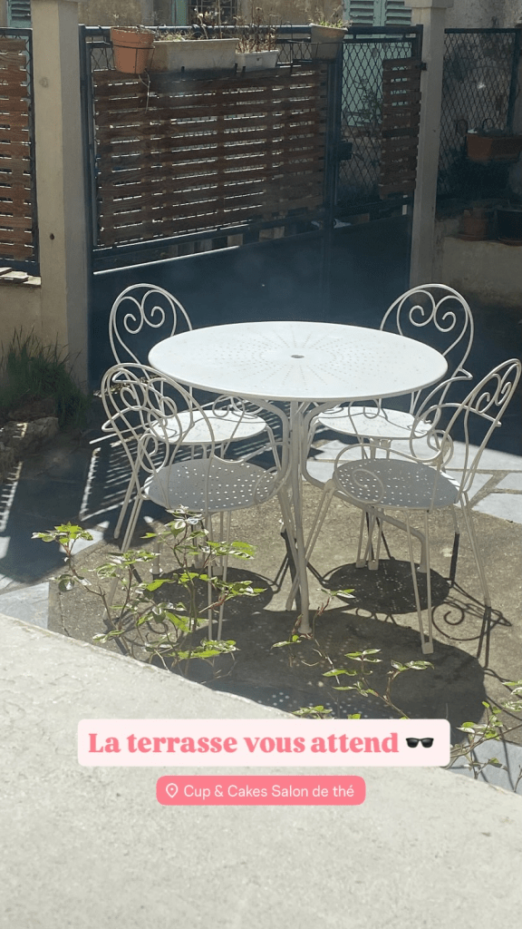 Our French niece-in-law Julie’s ‘Cup & Cakes Salon de thé’… Her English tea-room in a Paris suburb shows new pictures on Facebook – an outside sitting area, English-style cakes, scones and biscuits. Setting up and developing her business selling tea and cakes doesn’t just happen. She’s really making an effort.