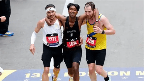 TV pictures of the Boston marathon… Close to the finish, exhausted Ajay Haridasse falls to the ground. He can’t get up. Aaron Beggs stops to pull up. Robson De Oliveira joins him. They put their arms around Haridasse and help him across the finishing-line, sacrificing personal bests. All marathon runners make an effort; these two make an extra effort.